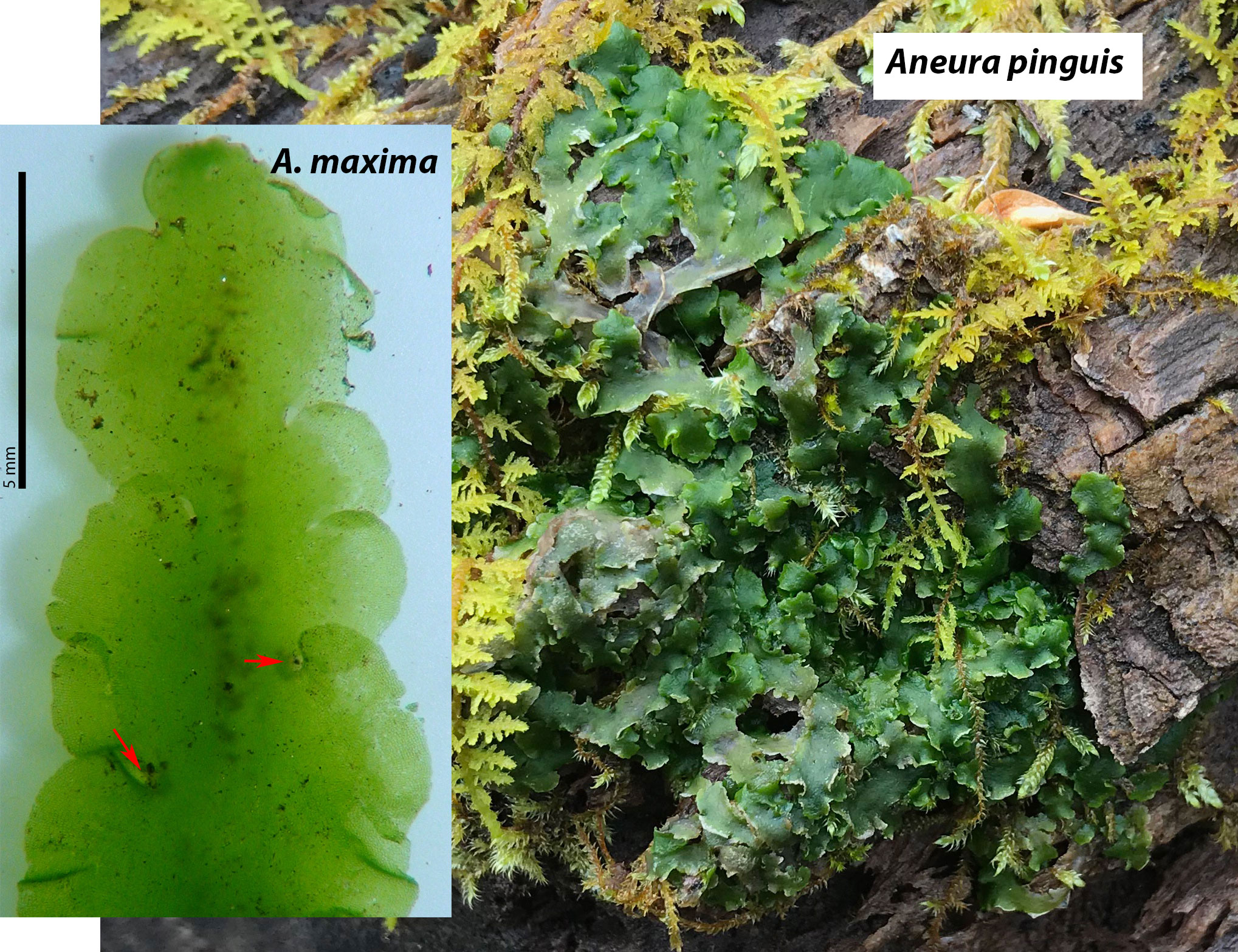 Aneura does occur admixed with Pellia in wet, seepy habitats and sterile thalli of the two genera can be troubling. While tedious to demonstrate, the apical notch of Aneura is protected ventrally by single-celled, sessile slime papillae while slime papillae of regional Pellia are two celled (the papilla cell subtended by a stalk cell). Pellia prefers mineral substrates and would not be found on non-silt covered logs, a common substrate for Aneura as shown above. Red arrows on the inset indicate the lateral position of archegonial clusters.