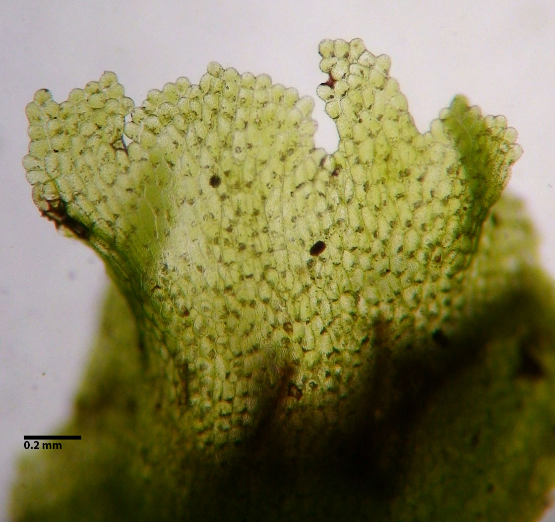 • Cells along the midline of the thallus 55-71 microns wide, larger than those of P. epiphylla (36-50 microns wide) (“median cell” measurements from Schuster 1992).