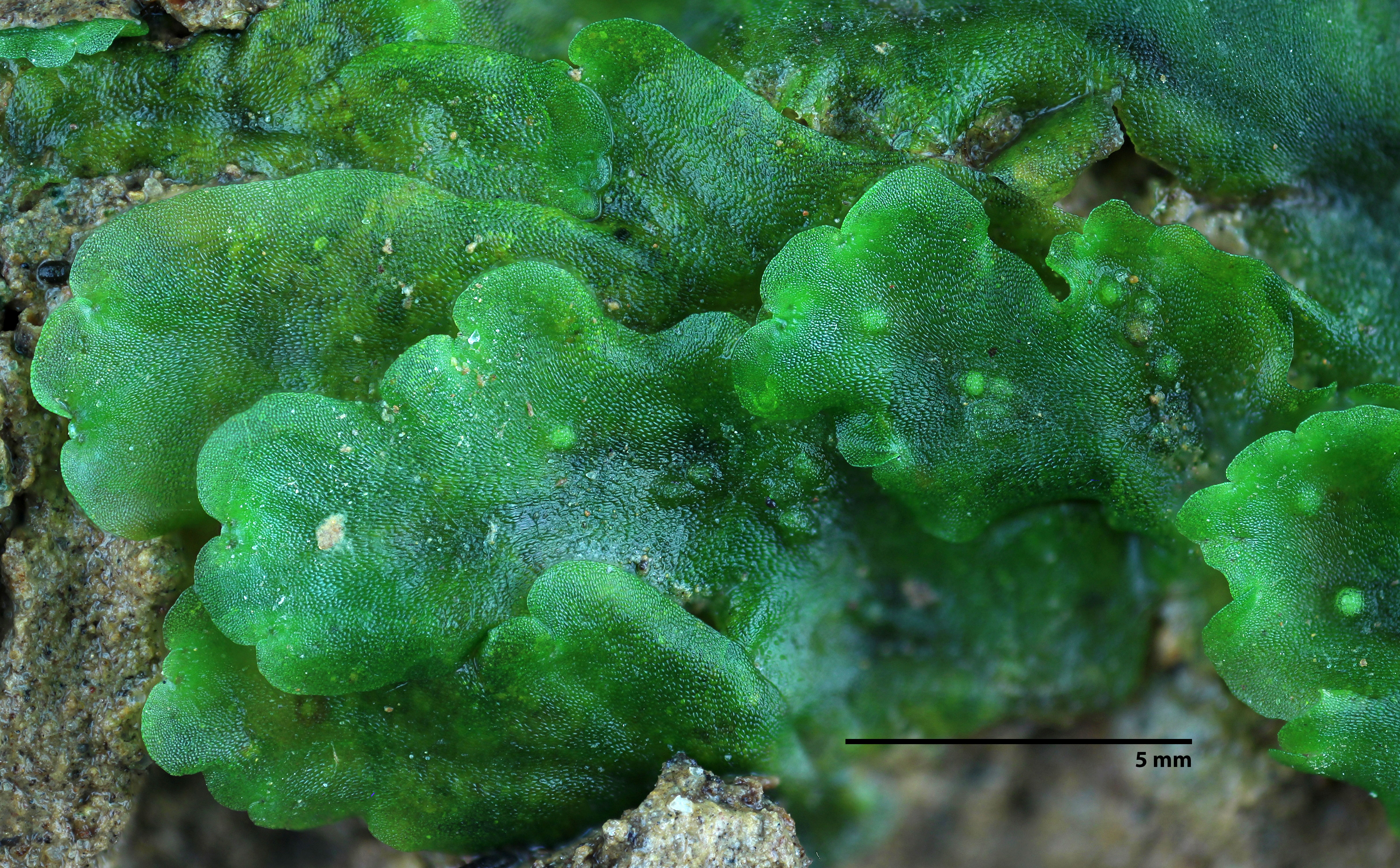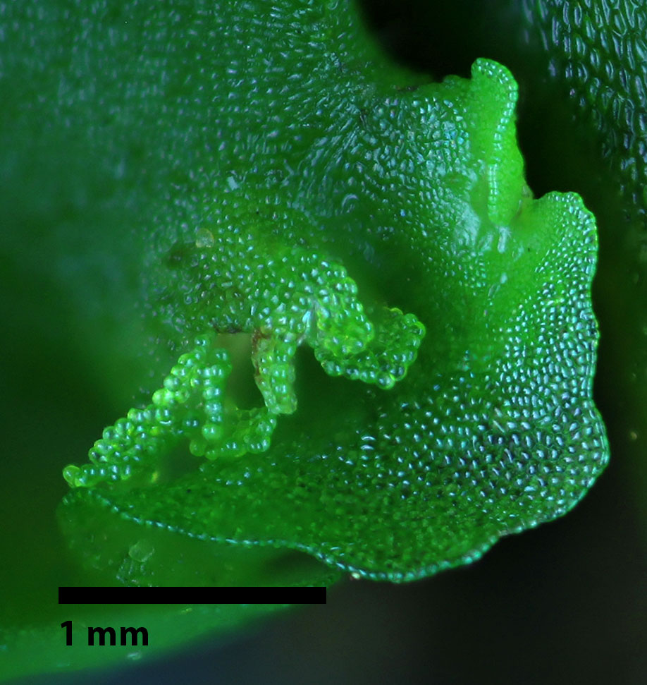 Antheridial pustules are rather subtle in this mat found growing in a shaded, protected rock shelter.