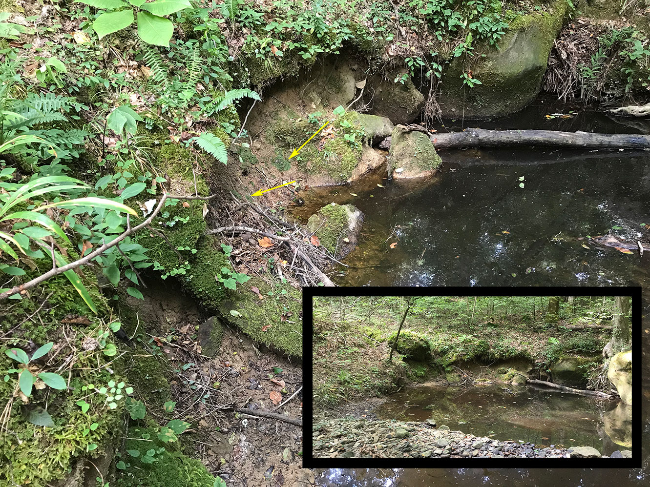 Disturbed soil of an undercut creek bank