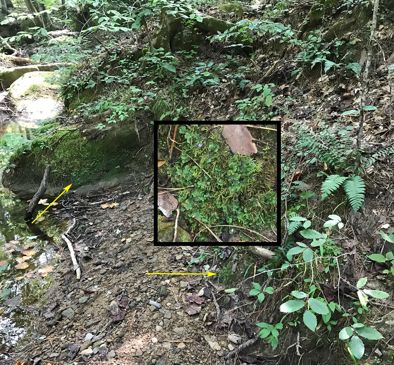 On soil over the base of a vertical rock wall on the bank of a stream. This population with very small embryonic sporophytes in late August, 2018.