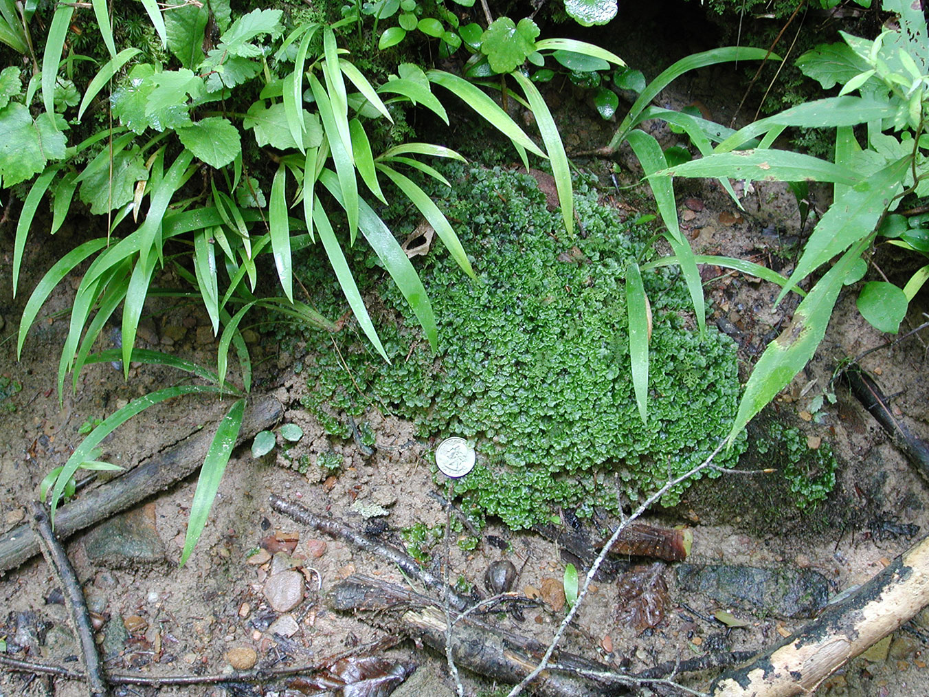 Occurring with Pallavicinia lyellii (notice the narrow central strand running through the thallus costa), Pellia epiphylla somewhat duller with slightly smaller cells, and the leafy liverwort Nardia lescurii.
