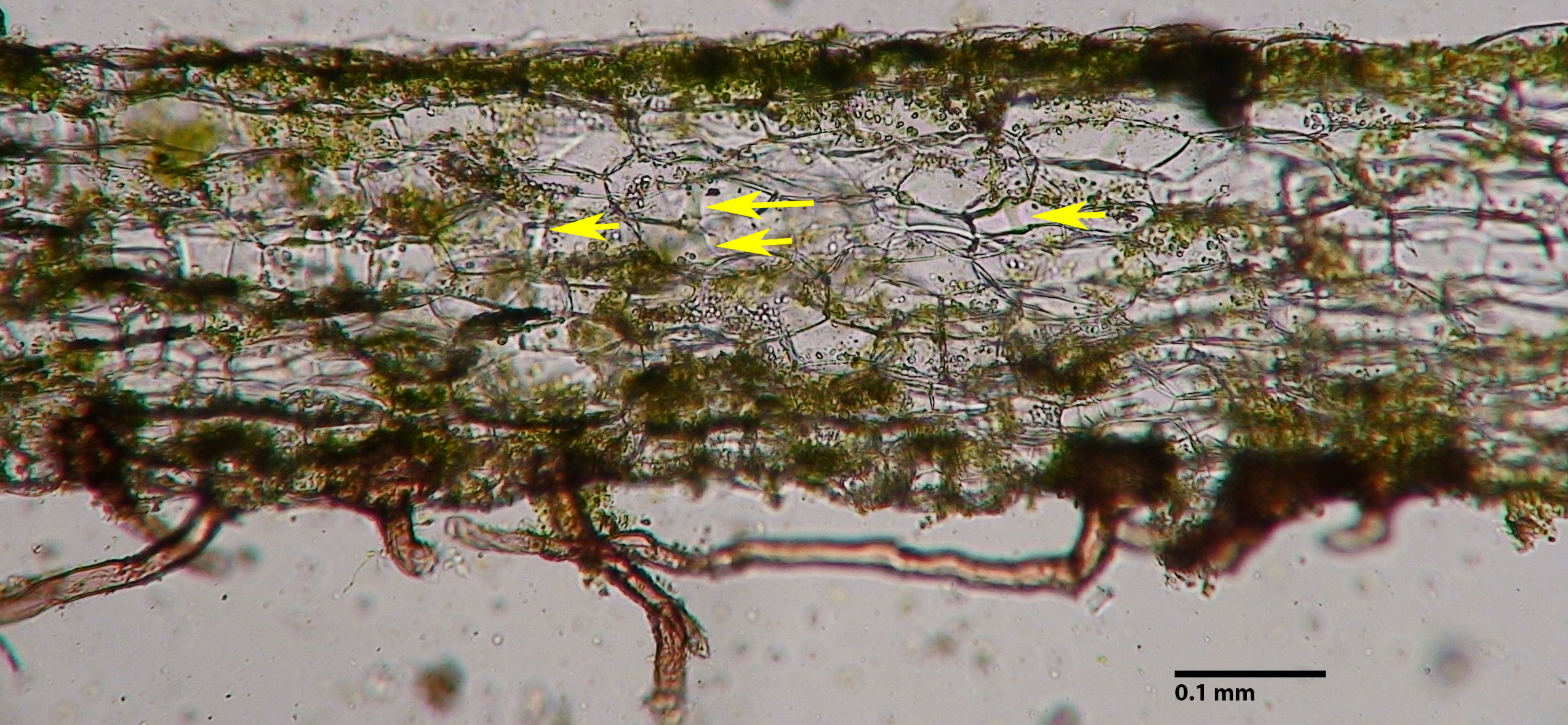 The costa of the thallus is more sharply demarcated than in Pellia and a narrow central strand within the costa is easily seen with transmitted light (central strand just visible at the two most left arrows).